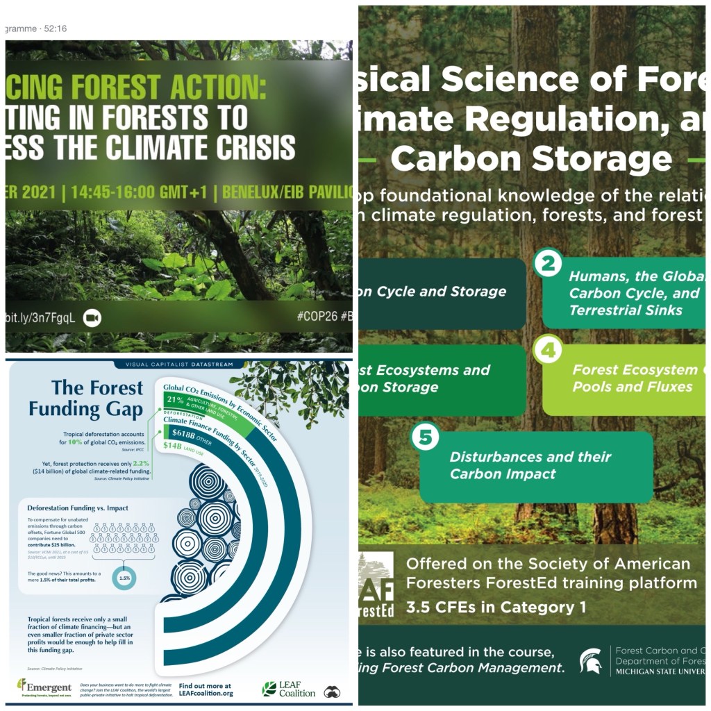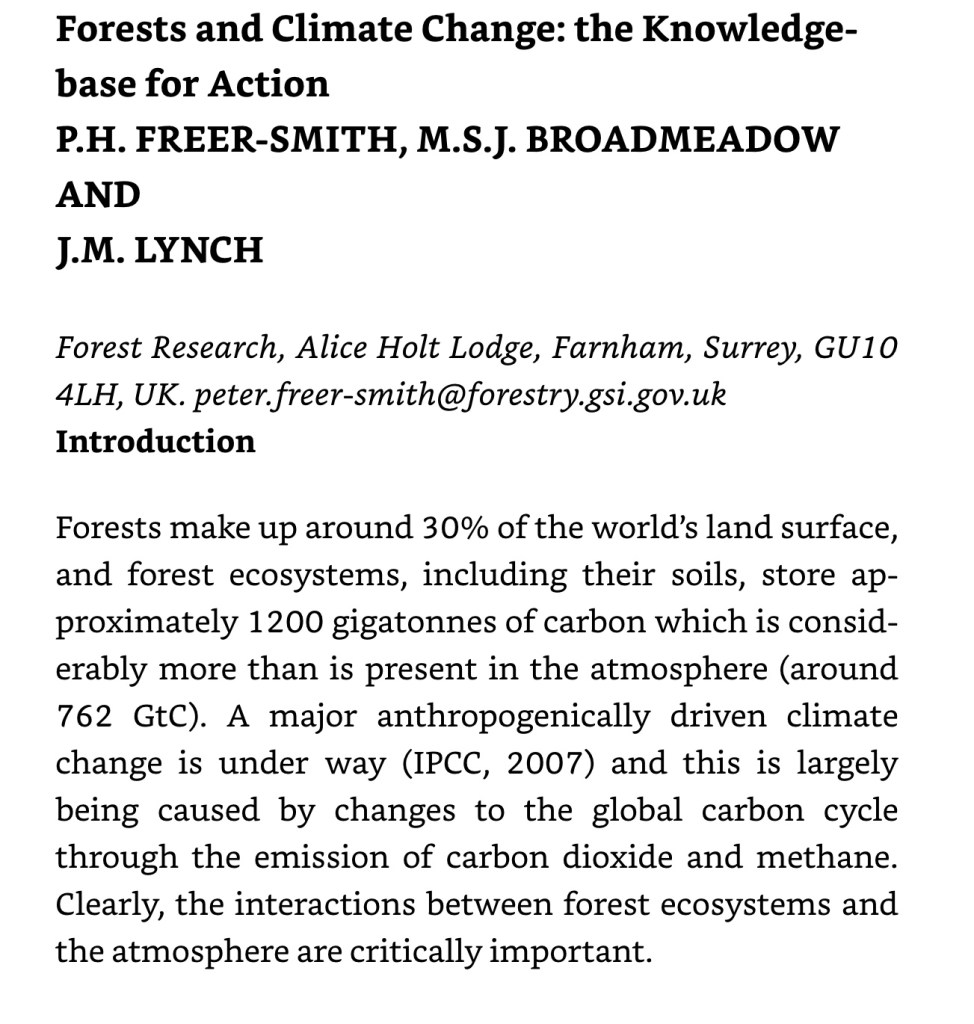 Flera olika artiklar som belyser olika aspekter kring skogsbruk och hur det påverkar klimatet. Dessa samlas i boken Forestry & Climate change. Allt från att gödsling kan ha flera motverkande effekter till att saker som ökar den levande biomassan kan ha negativ effekt på hur mycket kol som binds i marken är intressanta aspekter