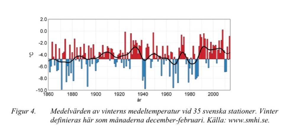 En intressant aspekt är att vintertemperatur inte har ökat lika mycket och skulle man studera norra Sverige skulle det var ännu tydligare.
