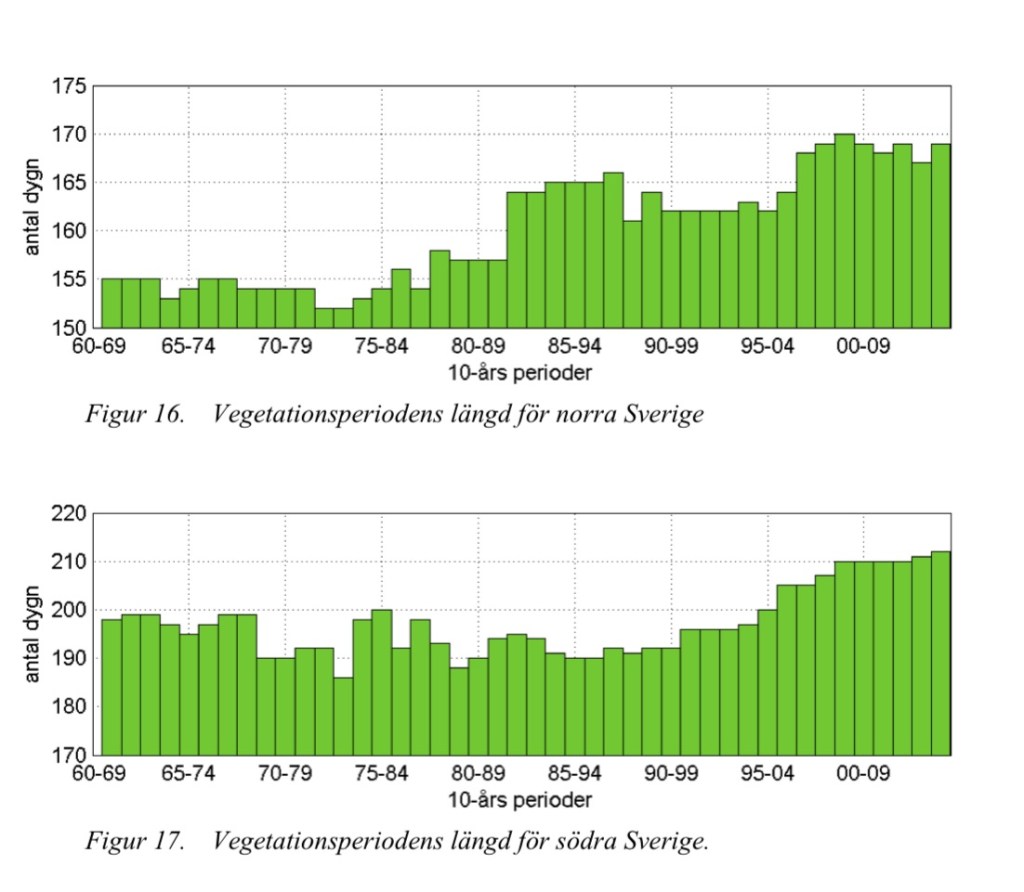 Vegetationsperiod kan vara en viktig indikator på hur hög produktion vi kan uppnå inom både jordbruk och skogsbruk. Vi vet ju att jordbruks- produktionen i södra Sverige är betydligt högre och även om längd på vegetationsperiod bara är en indikator så kan man anta att förlängd period kan innebära positiva effekter för Sverige.