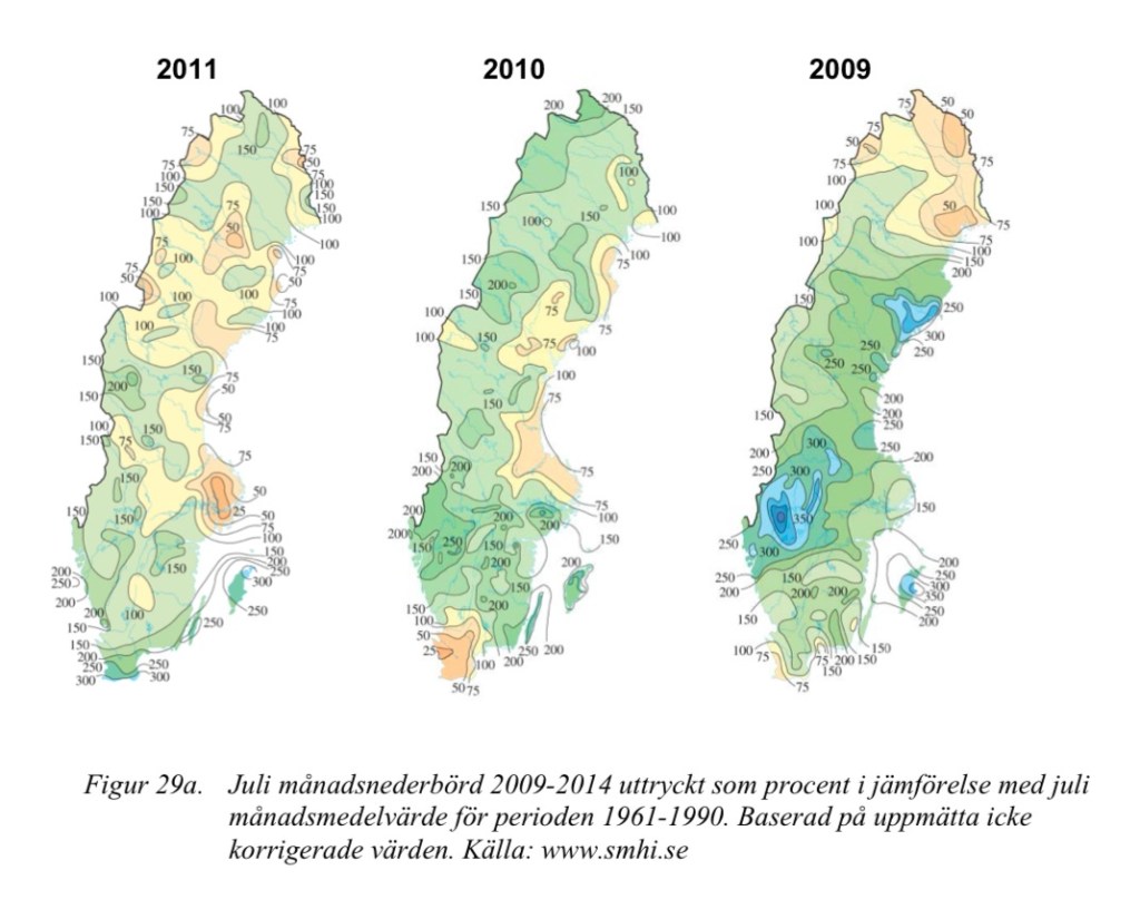 På de flesta platser i världen är nederbörd otroligt avgörande för skördar och jordbruksproduktion. Sverige har dock oftast en sjysst mängd nederbörd även om denna skiftar kraftigt beroende på år. Det blir därvid svårt att hitta några signifikanta trender beroende på klimatförändringen. Det är rimligt att dra slutsatsen att vi hittills bara haft liten påverkan på jordbruksproduktionen. Att gissa att även framgent så får detta liten effekt är fullt möjligt.
