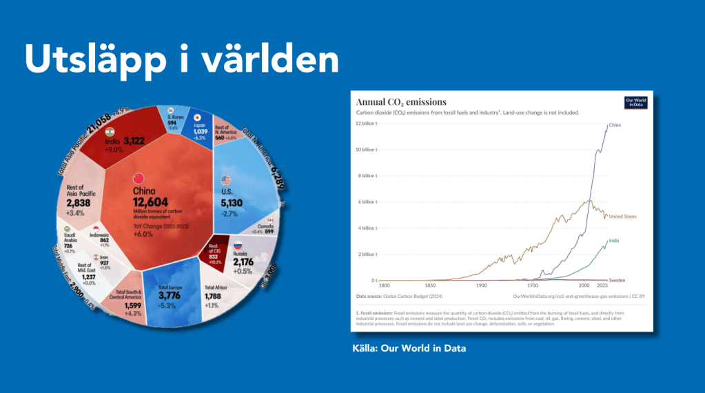 Vi kan sedan också se en förändring bland utsläppare i världen där Kinas och Indiens utsläpp blivit en dramatiskt större andel. Även trenderna är sådana att detta kommer ytterligare förstärkas.